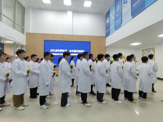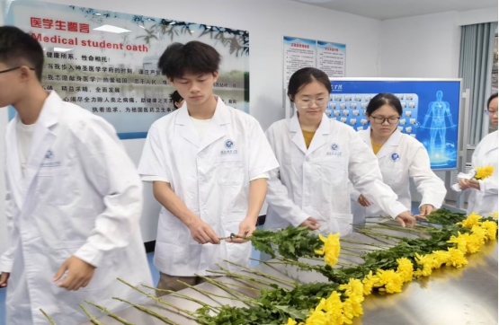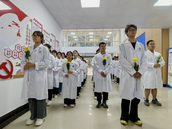 活动现场庄严肃穆,2025级全体新生身着整洁的白衣。在进入标本馆前,同学们相互整理衣冠,以最整洁的仪容表达对生命奉献者的尊崇。随后,学生们依次接过象征感恩、敬畏与永恒缅怀的黄菊花步入标本馆列队,辅导员老师向同学们重申了本次活动的行为规范。