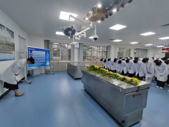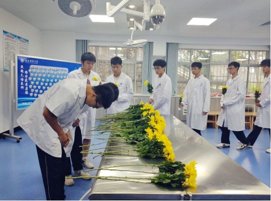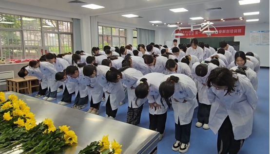 步入解剖室,新生们依次上前,将手中的黄菊花轻放在解剖台旁,以无声的仪式为这份生命的厚重馈赠致以最崇高的敬意。随后,在潘丹老师的带领下,全体学生肃立,向“无语良师”三鞠躬,每一次躬身,不仅凝聚着对奉献者的无私大爱的深切感恩,更将内化为他们潜心求学、矢志从医的坚定力量,许多同学眼中泛起了泪光。