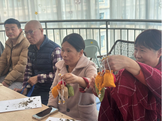 当传统习俗遇上暖心陪伴,节日的内涵便在这一针一线中被具象化。本次活动特别设置了艾草香囊制作环节,志愿者们备好了清香的艾草与各式香囊布料,老人们则专注地挑选、填充。指尖翻飞间,一个个充满着祝福与希望、散发着淡淡清香的艾草香囊逐渐成形,欢声笑语中,传递着安康祥瑞的美好祈愿。