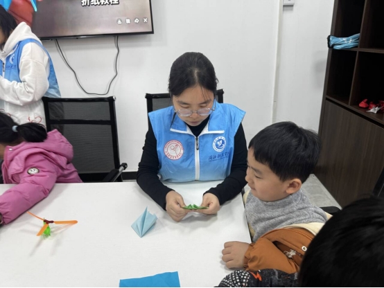 科普宣讲环节落幕,趣味手工制作活动温情开启,志愿者陈佳怡牵头负责手工指导,耐心细致地为孩子们讲解“小燕子”折纸步骤,手把手示范折叠技巧,其他志愿者分工协作,一同俯身帮忙,及时为动手能力较弱的孩子答疑解惑、协助塑形。彩纸在孩子们手中灵活翻飞,折叠、塑形有条不紊,一只只形态灵动的手工燕子接连成型,孩子们全程专注投入,沉浸在动手创作的乐趣中,完工后纷纷举起自己的作品热情展示,彼此分享创作喜悦,现场欢声笑语不断,氛围温馨而热烈。