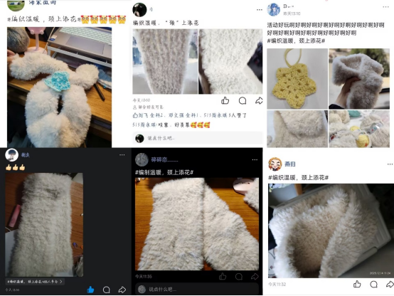 12月6日至16日的线上打卡,让生命感悟持续延伸。同学们带半成品进行创作,以“编织温暖,‘颈’上添花”分享成果:“每多织一行,便多一分对‘坚持’的理解。”全程参与者获赠小礼品,这份心意承载着老师们的期许,愿他们以对生命的认知与热爱,在医学路上前行,既做生命守护者,亦做自我追光者。