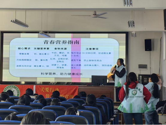 活动针对初中女生青春期面临的生理与心理变化,通过情景模拟、趣味问答等互动方式,开展专业科普教育。志愿者们结合医学专业背景,将青春期的生理知识及营养健康内容转化为生动易懂的课程,重点讲解了骨骼发育、月经周期健康、皮肤与内分泌等方面的科学知识,并提供了具体实用的膳食指导,帮助女生树立正确的健康观念与自我保护意识。